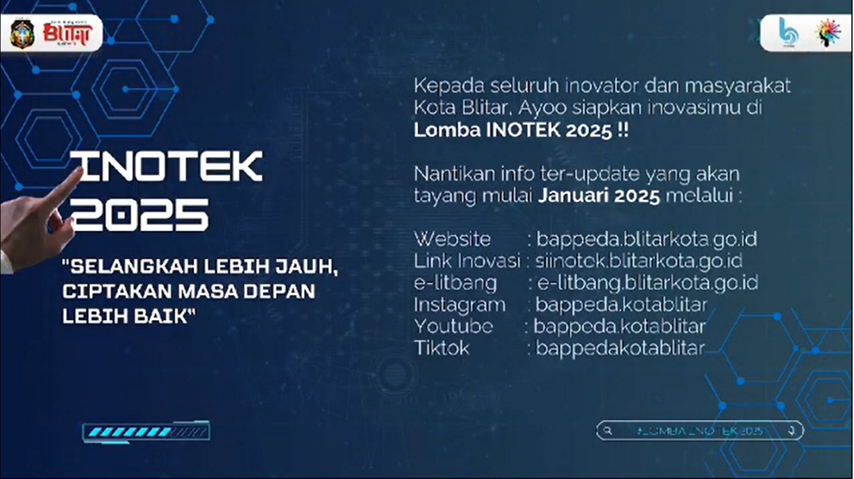 Pemerintah Kota Blitar melalui BAPPEDA mengucapkan terimakasih dan apresiasi kepada seluruh inovator Kota Blitar yang telah berpartisipasi dalam Lomba Inovasi Teknologi (INOTEK) tahun 2024. Dengan harapan semoga semua produk inovasi yang dihasilkan dapat bermanfaat dan berkelanjutan bagi peningkatan kesejahteraan masyarakat, serta menjadi inspirasi bagi sobat-sobat inovator lainnya dalam berkreasi dan berinovasi untuk Kota Blitar yang semakin KEREN...