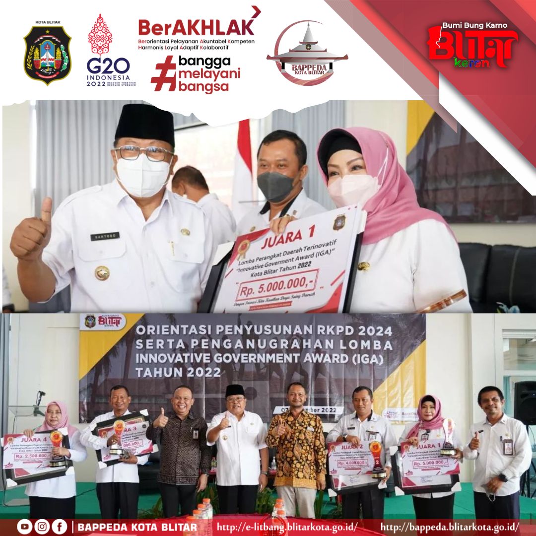 Hari Rabu, 7 Desember 2022, Pemerintah Kota Blitar melalui Bappeda, menyelenggarakan acara “Orientasi RKPD Kota Blitar Tahun 2024 serta Penganugerahan Lomba Innovative Government Award (IGA) Tahun 2022 dan Diseminasi Laporan Hasil IGA” bertempat di Ballroom Lelly Hotel Puri Perdana Kota Blitar.